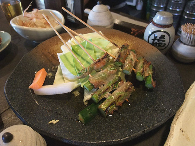 アスパラ巻きが出てきたときに、余りに旨いのでびっくりした。アスパラへの火の通り具合は最高だ。すごい。こんな火の通りのアスパラを食ったのは初めてだ。そして周りに巻いてあるベーコンが薄くてめちゃくちゃ旨いのである。このほかにもトマト巻き(プチトマトの周りにベーコン)、えのき巻きを食ったが、いずれも野菜への火の通り具合の見事さと、ベーコンの何とも言えない味が相まって、めちゃくちゃ旨かったのである。