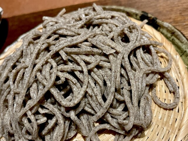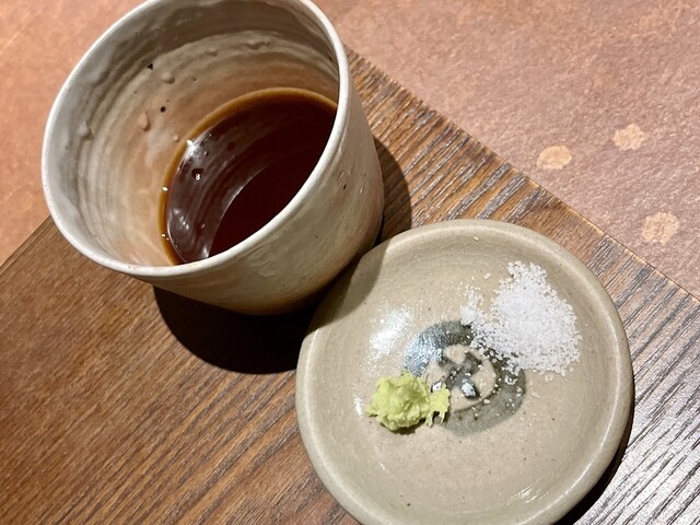 まずは、十割そばが来ました!色がかなり黒く、粒々が分かるような見た目で期待が高まります(笑)…イタリアの塩だけで食すと〜蕎麦の香りが高く鼻に抜けます。十割なのにパサパサ感も無く、けっこうなコシもあり喉越しもよくツルッと頂けました!美味しいですね〜〜久し振りに香り高いお蕎麦に出会えました。つけ汁は少量だったので、塩辛い濃いタイプかな?と思いましたら、鰹出汁が効いた旨味が強いタイプで塩っぱくも無く美味しかったです!