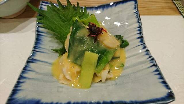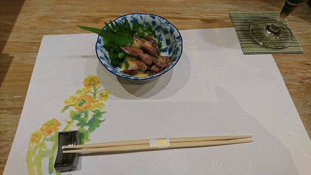 蒸し豚と季節野菜の揚げびたし。菜の花、アスパラ、新じゃがの素揚げと柔らかい蒸し豚を包み込んで負けないしっかりしたかつおだしのミックスが美味しい。