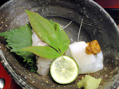 魚は鰆とイカのウニ乗せ。新素材を大事にする文句なしの和食の一品です。