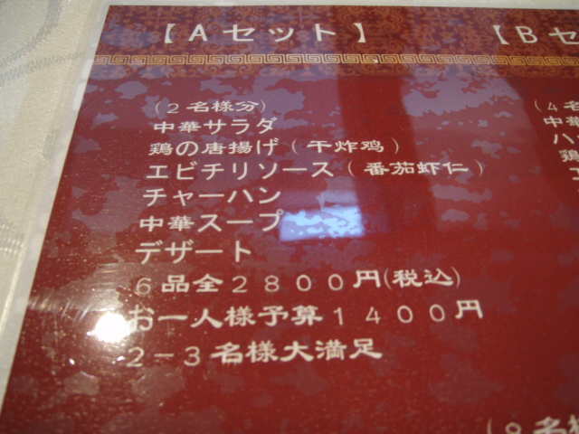 後日、お店で食べたくて2名で再訪。2名向けのAコースをオーダーしました。内容は見た目もキレイなキュウリとニンジンの千切りとくらげとお肉がアクセントになった前菜の中華サラダ+食べやすい大きさの鶏肉をカラリと揚げた塩仕立ての鶏の唐揚げ+大き目のえびがゴロゴロと迫力があり餡の野菜のシャキシャキ感が良いエビチリソース+細かく色んな具がちりばめられたチャーハン+薄味で具沢山の優しい味の中華スープ+プチデザートの杏仁豆腐で2名2800円