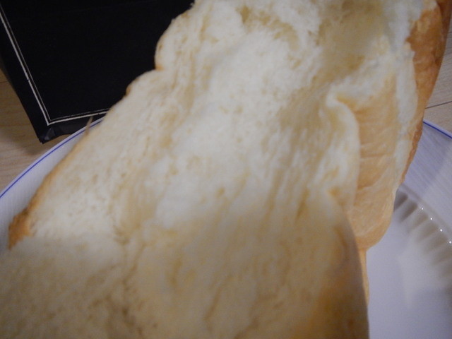 焼きたてはふわほわ ちょっと割ってみる やっぱり柔らかい 手触りキメ柔らかさ おかめやの工場売りパンに負けてない