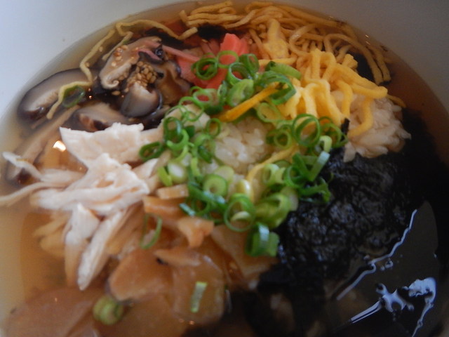 鶏飯 そばつゆ仕立てのお茶づけ状態 チキンにシイタケ野菜 彩り美しく 食感良し