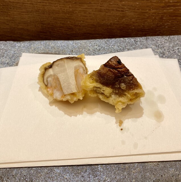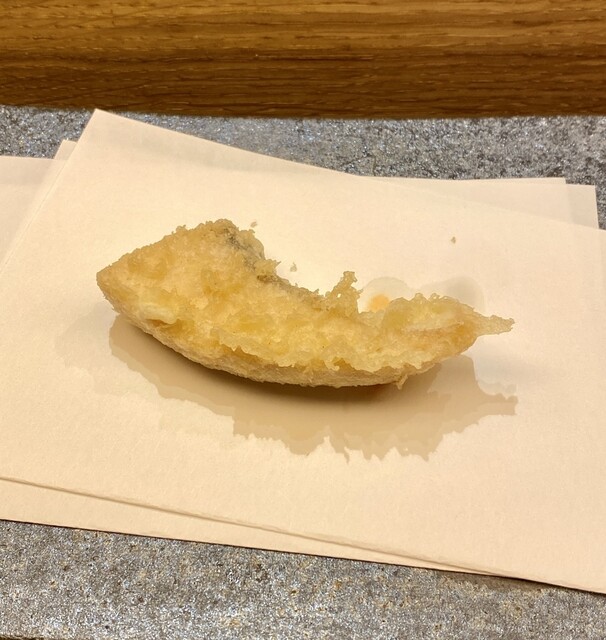 とうもろこしは甘味が有るが、意外にも天麩羅にしても美味しい。マッシュルは、ペースト状にしており、香りが立ってくる。帆立貝は、レアに近い揚げ方で、そのまま供した後に、海苔に巻いた磯部焼きとしても供する。