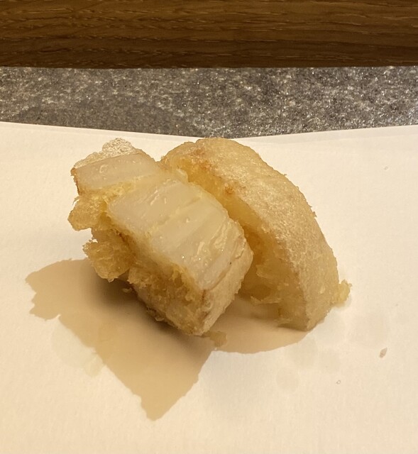 帆立貝は2種類の方法で供された。半身の一つは通常の揚げ方。外側は揚がっているのに、中はレアに近い見事な揚げ方。新しい趣向として、もう一つの半身を磯辺焼きの要領で海苔に包んで手渡しする。鮨屋みたいな演出だ。