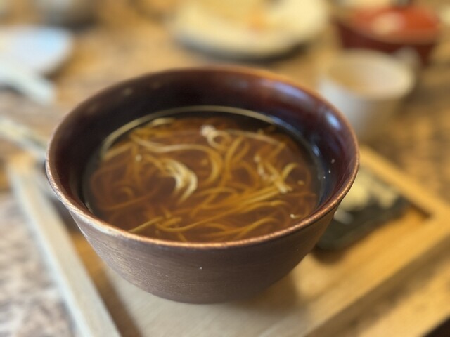 器も素朴でありゴツゴツした個性の強い織部焼を中心に有田焼、木製の蕎麦どんぶりなど細部にまで美を探求したいるのがとれる店である。