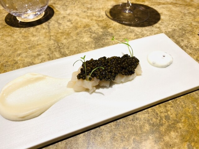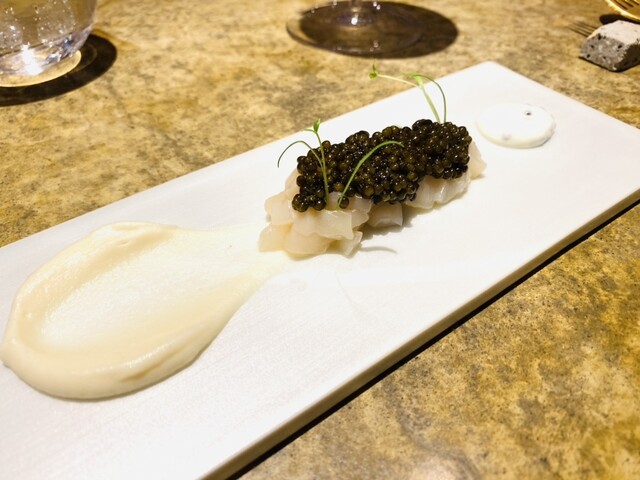 無塩の帆立の上には、宝石のように輝くキャビア!