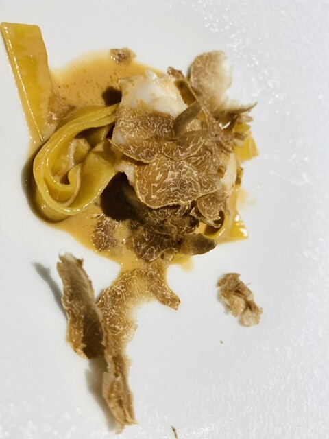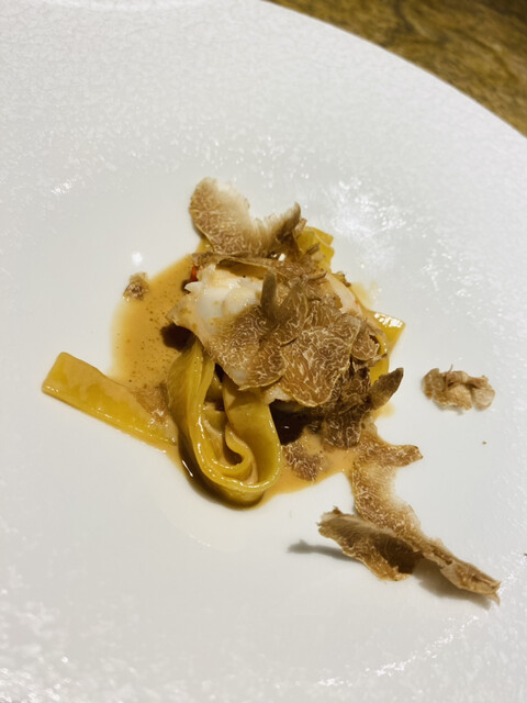 白トリュフをふりかけられた贅沢な伊勢海老タリアテッレ