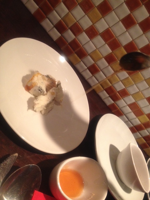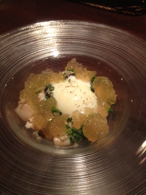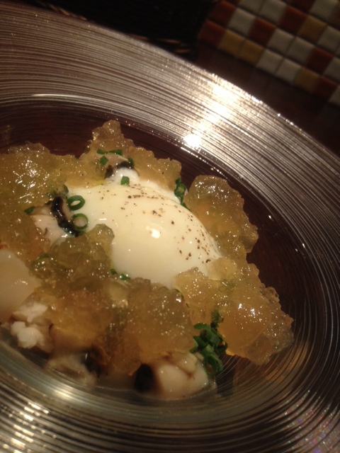 前菜に、牡蠣とホタテを混ぜやすく、ブロック状にカット、温玉とジュレで豪快に混ぜて頂く、スモークされた貝の香りが食欲をそそります。