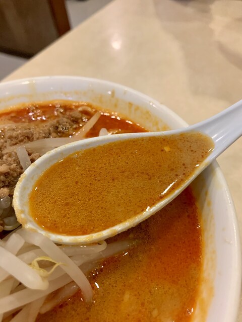 担々麺あるあるですがスープは少しだけぬるいです。ぬるいので大辛が活きてきます。大辛にするとかなり辛いのですが少しぬるいので食べられます。熱々でこの辛さだと相当厳しい戦いになりそう。