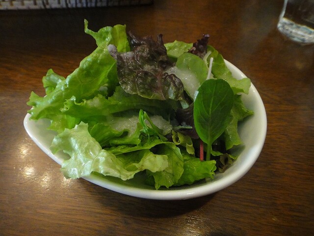 最初に提供されるサラダ。白いものはチーズと間違えがちですが卵白です。
