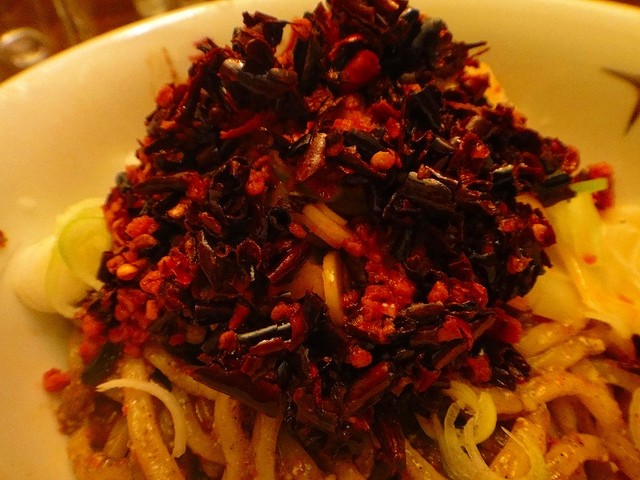 スープだけでなく麺にすらたっぷり辛そうなものがまぶしてあります。