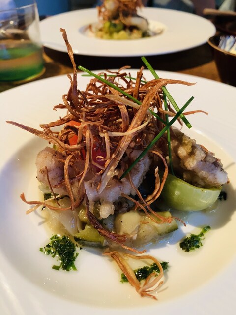 キンメの香ばしさと林檎の酸味、爽やかでスパイシーなジュレ、ピンクペッパーの香り。いろんな風味があって楽しい一品です。