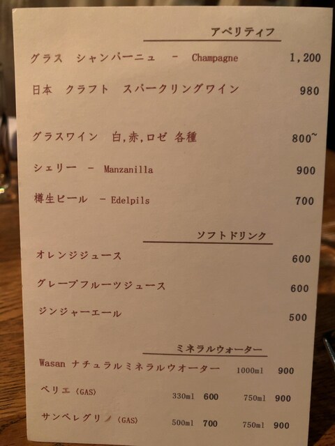 コースメニュー。以前はいくつかの種類から選べましたが、コロナの影響かわかりませんが一択式で、品数を減らすことはできるようです。