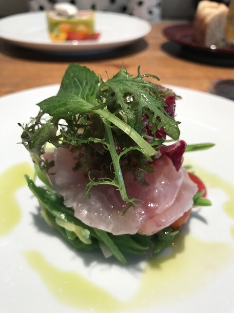 青森県産の穴子はふっくらフリットに。イタリア語だとフリット。フランス語はベニエ。英語だとフリッター。ふっくらプリプリの揚げ上が緑のハーブも効いており、アミューズに続いて和食みたいな味わいも。
