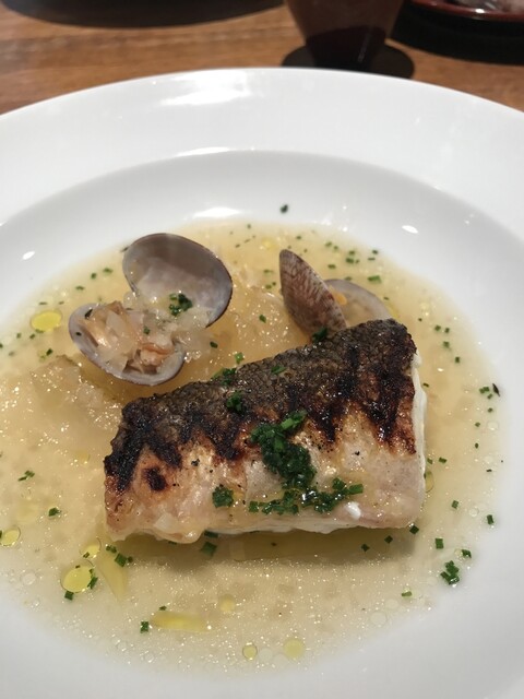 出汁を吸ったレンズ豆、ふっくら仕上がった空豆、アーモンドの食感、パリパリふっくらにソテーされたスズキ。