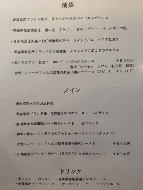 最初は2,700円にしようと思ったのですが、3,800円にすると肉も魚も食べられる上に、メインを選ぶ際にお値段プラスになっている品をお値段そのままで選べると知り、誕生日でもないのに3,800円のコースにしてしまいました。
