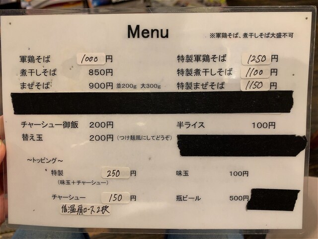 メニュー。軍鶏そばが900円→1,000円に値上がりしてました。