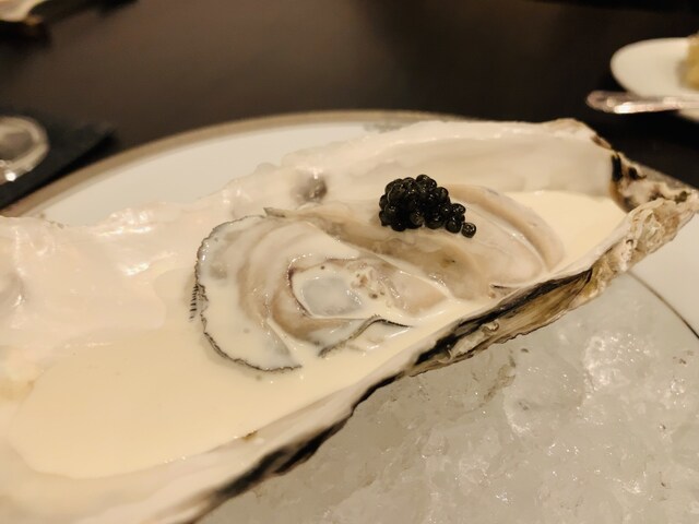 牡蠣は三陸産。シャンパンを煮詰めたソース。食べてみるとめちゃくちゃシャンパン。