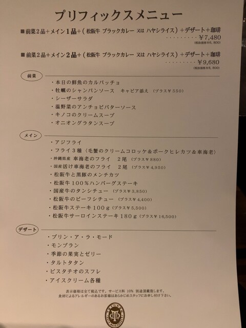 プリフィックスメニュー(前菜2品+メイン2品+デザート+コーヒーで税別8,800円)を紹介します。
