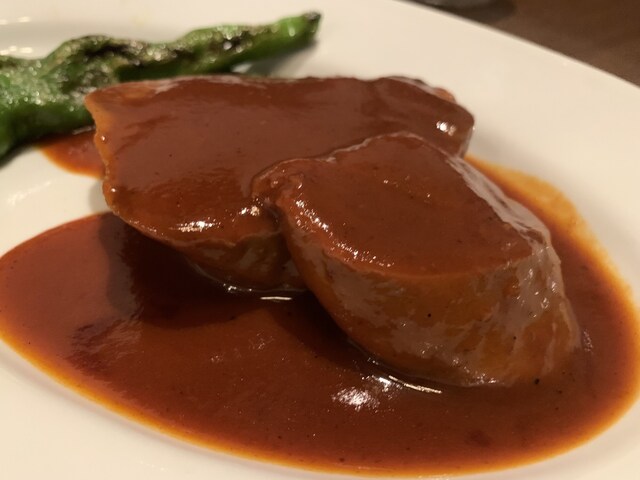 ほんのりピンク色の豚肉とデミグラス&マスタードという感じのソース。