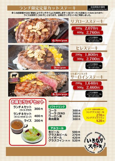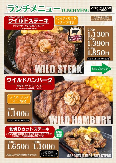 初めてですから、ランチサービスのメニューに有る、ワイルドステーキ300グラムとハンバーグ300グラムを食べてみることにしました。(二人で偵察です。)