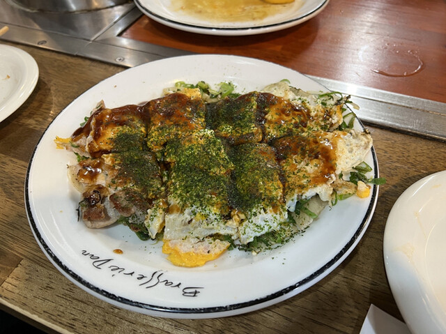 お好み焼きは、ぱりっと焼かれた麺とふんわり重なる生地が絶妙。