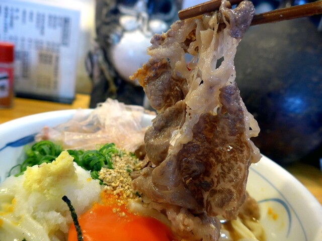 黒毛和牛がたっぷり入っていて、お肉の風味漂う贅沢なうどん。