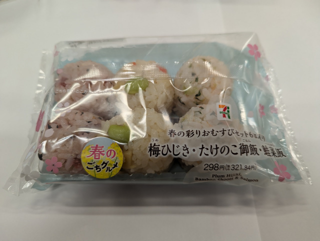 セブンイレブン 「春の彩りおむすびセット 6個入り 梅ひじき・たけのこ御飯・鮭菜飯」 (2025/03/22)