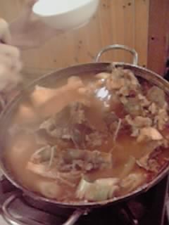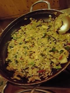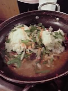 日本の鍋と違い、具をすくい上げ、スープを少量にしたところに御飯を入れます。ここでは、タマネギ、ニンジン、赤ピーマン、ニラ、春菊等の細かく切った野菜を一緒に入れて混ぜ、鍋に押し付けるようにして出来上がり。(お好みで少し待った方がおこげができてより美味しいです。)