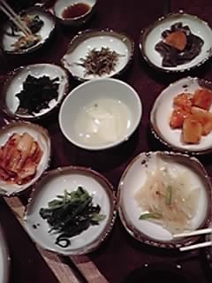 パンチャン(小皿料理): 水キムチ、ジャガイモのナムル、ほうれん草のナムル、白菜キムチ、ワカメの煮物、小女子を蜜で絡めたもの、こんにゃく煮、カクテキ(写真中央、そして手前から時計回りで。正式名称がわかりませんので悪しからず)。