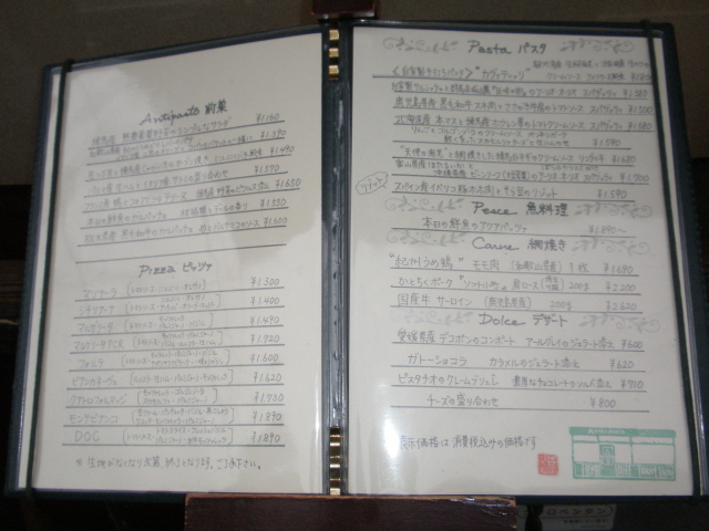 本日の鮮魚のカルパッチョは金目鯛、本日の鮮魚のアクアパッツァは真鯛(お魚料理は時価になるようでその日の価格をお知らせくださいます)、ほたるいかは入荷しなかったのでほたるいかとビーンリーフのスパゲッティは無しとのことでした。