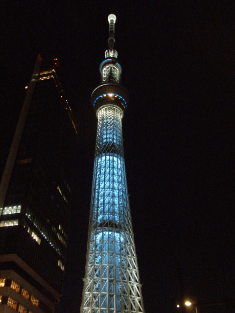 帰途、スカイツリーの青い光が寒空に燦然と輝いていました。