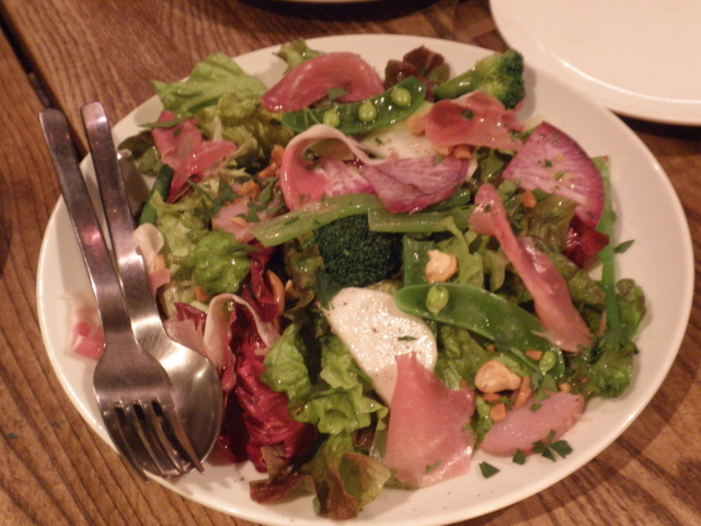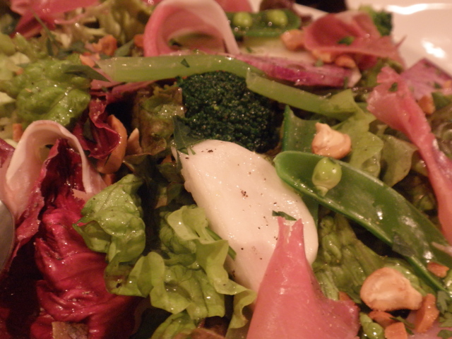 パルマ産生ハムのサラダ: サニーレタス、トレヴィス、紅芯大根、スナップエンドウ、ブロッコリー、ほうれん草にコリアンダーのみじん切りもふりかけられている模様。