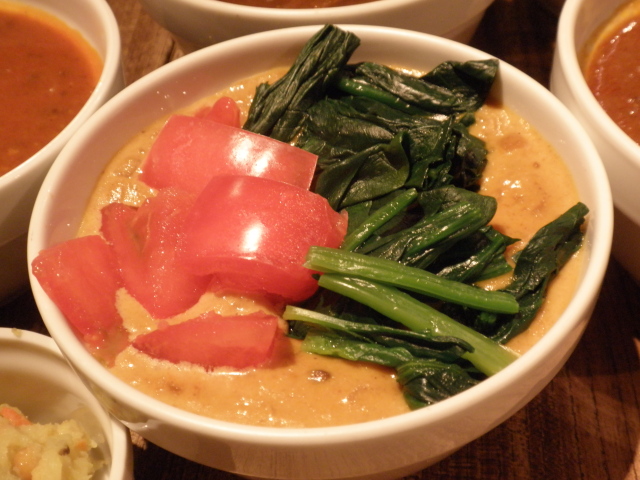 ココナッツカレー: トマトとホウレン草が上にのった可愛らしい盛り付けです。