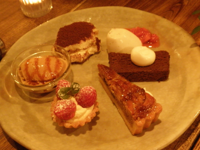 (上から時計回りに)パンナコッタ 苺ソース添え、チョコレートケーキ、カスタードプリン、苺のタルト、ティラミスキャラメルのジェラート。