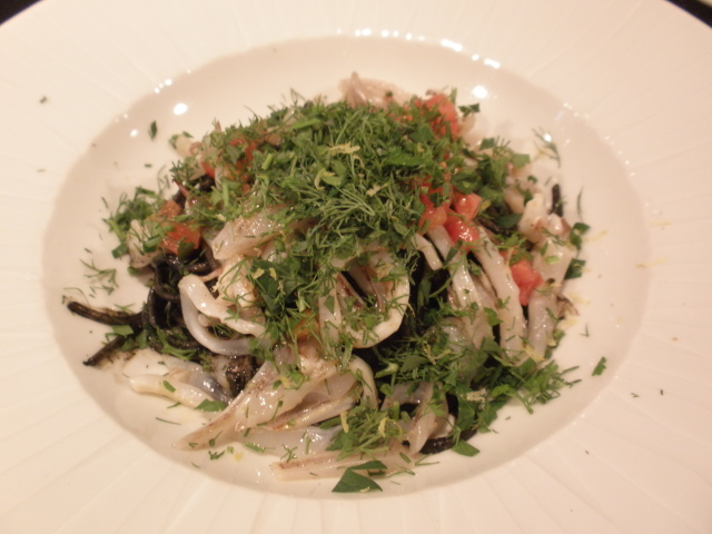 半透明の白イカ、細かくカットしたトマト、たっぷりの香草に覆われ、イカスミソースはどこでしょう・・・?