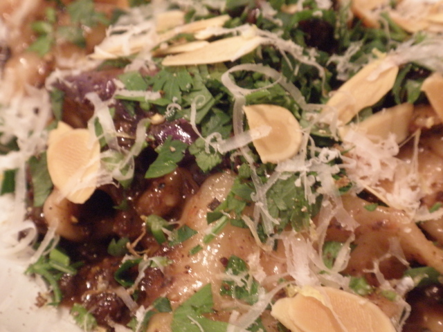 挽肉たっぷりなミートソースには、アーモンドスライスと香草、さらに細く削ったパルミッジャーノがたっぷりかけられていました。