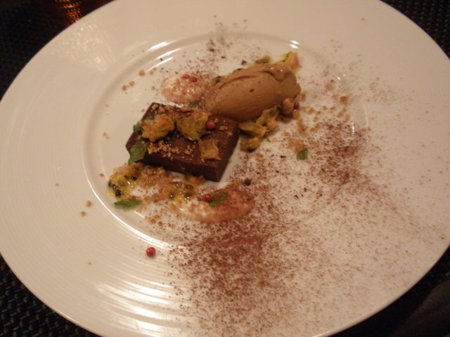 細かく砕いたナッツ、ピンクペッパー、フレッシュミント、甘酸っぱいパッションフルーツ、ヨーグルトソース、ココアパウダー・・・様々なお味の混合を楽しめる大人っぽいデザートでした。