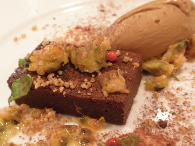 チョコレートケーキ スパイスとナッツの香り キャラメルのジェラートとパッションフルーツ添え