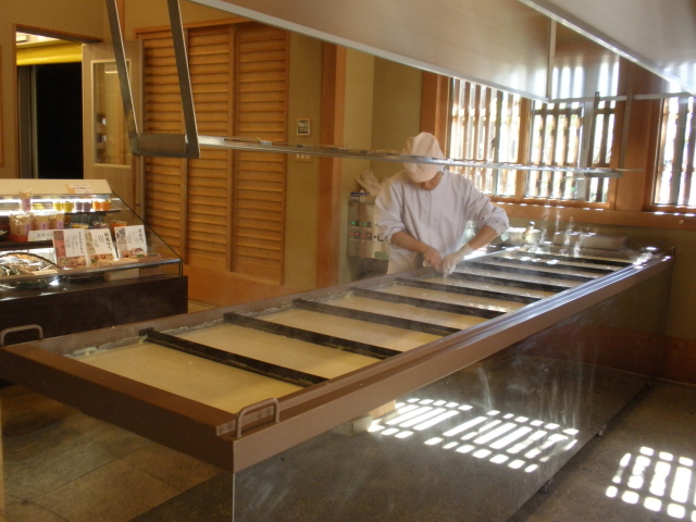 引き戸を開けて中に入ると、大きな湯波槽が右手に、その少し奥に各種豆富・湯波製品がきれいに並んだショーケースが目に入ります。