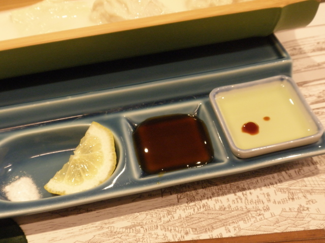 手前に置かれたモンゴル岩塩とレモン、醤油あん、オリーブオイルをお好みでつけていただきます。