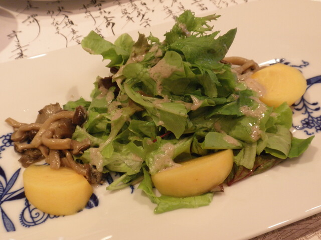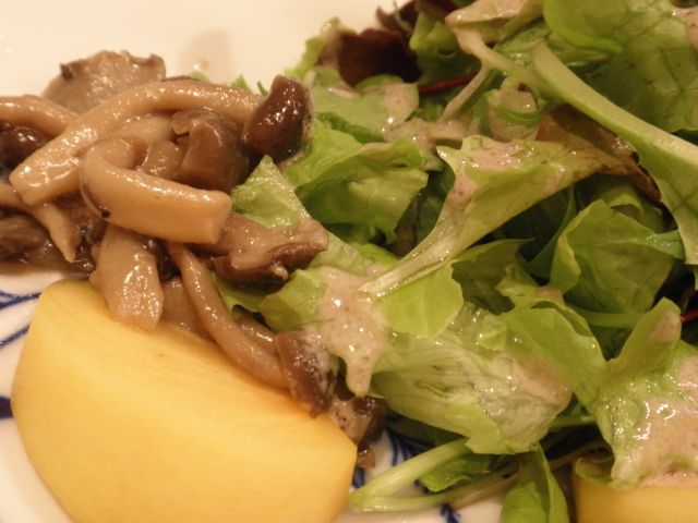 新鮮な葉野菜にキノコの食感、コクのあるクリームマッシュルームドレッシングが相性良く、コリッと硬めの柿を箸休め的にいただいて・・・。