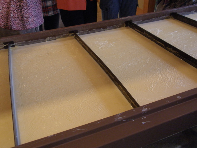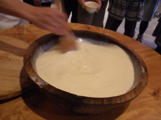 豆富 よせたて豆富: 大鍋で煮ている豆乳ににがりを入れ、見る間に固まっていくパフォーマンスが見られます。