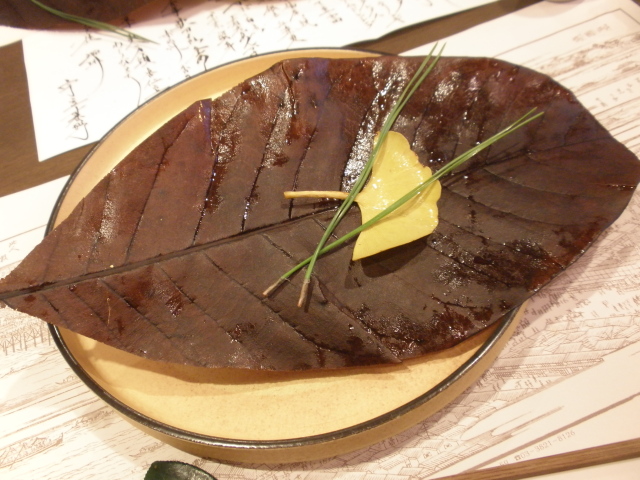 焼物 鰆の柚庵焼 栗 銀杏 紅葉麩: 朴葉の上には黄色く色づいた銀杏と青い松葉。