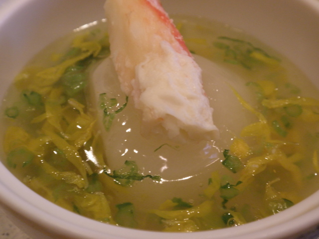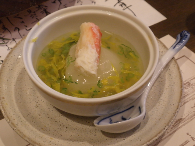 菊花の良い香りとかぶ菜のしゃりしゃりとした食感、蟹身の甘さと共にいただくと、上品なお出汁との相乗効果でお味に膨らみが感じられました。
