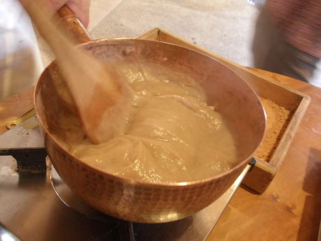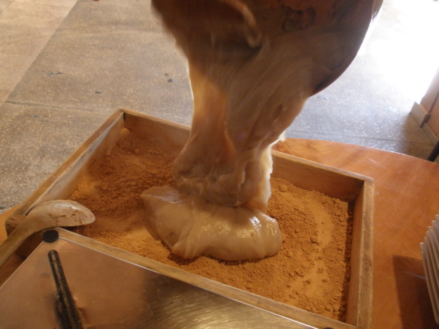 火にかけたわらびもちが固まっていくところ、それをきなこの上にのせ、一つ一つ丸めて出来上がるところが見られました。