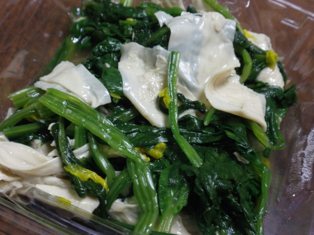 ゆばとほうれん草のお浸し(100g 380円): 歯応え良いほうれん草に菊花の香り、しっかりとした湯波がふんだんに使われていて、上品で贅沢なお浸しでした。