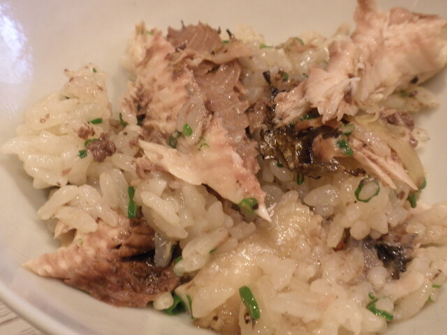食事 秋刀魚釜めし 赤出汁 香の物;綺麗に骨を取り