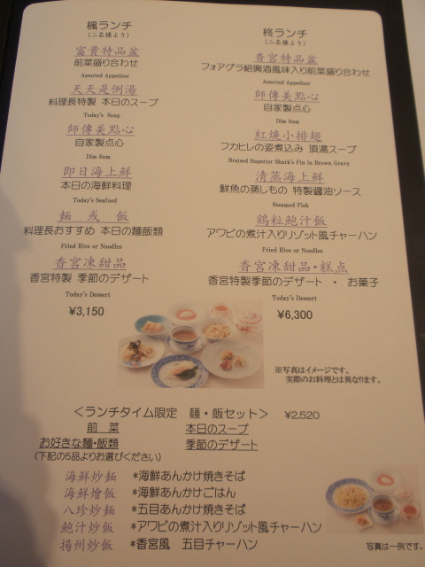 前菜盛合わせ、料理長特選 本日のスープ、自家製点心、本日の海鮮料理、料理長おすすめ 本日の麺飯類、香宮特製 季節のデザート